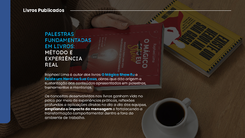O palestrante mantém a mesma linha de comunicação, linguagem e metodologia do primeiro ao último dia do evento, criando unidade e conexão entre os temas.