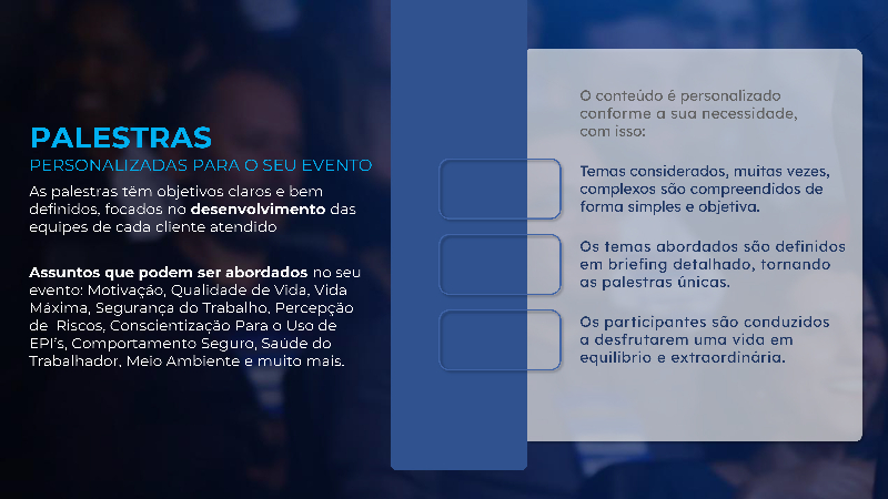 A empresa não precisa se preocupar com a condução das palestras. Todo o processo, do início ao fim do evento, é conduzido com profissionalismo, organização e segurança.